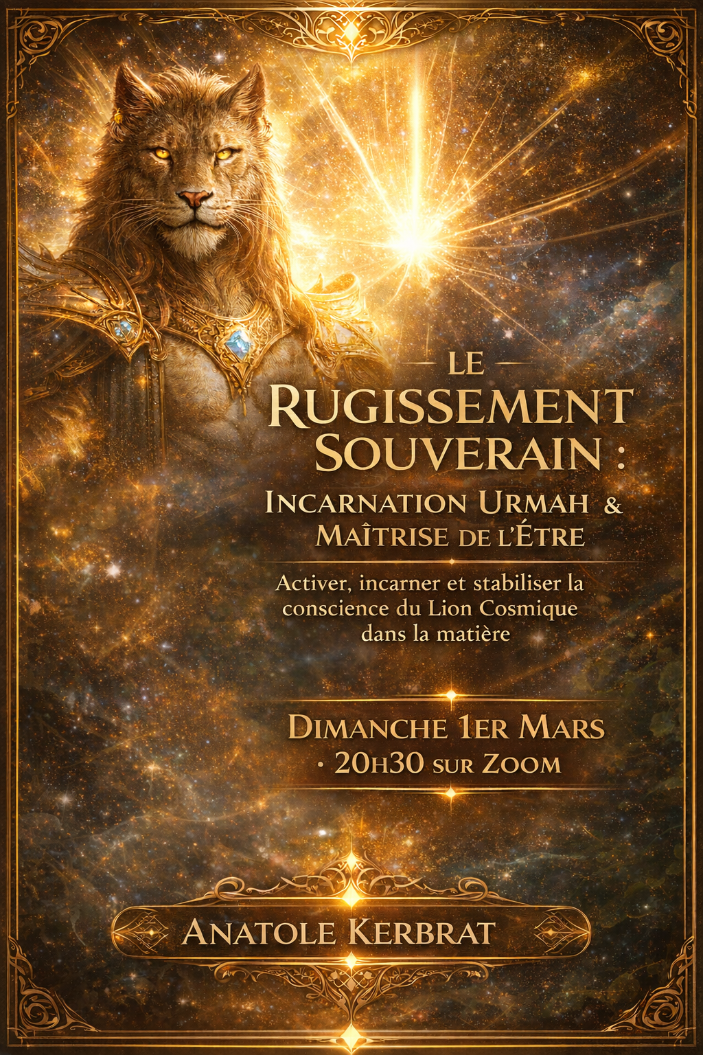 « Le Rugissement Souverain : Incarnation Urmah & Maîtrise de l’Être » Activer, incarner et stabiliser la conscience du Lion Cosmique dans la matière Date de l'atelier : Dimanche 1er Mars à 20h30 sur Zoom Atelier avec un Replay
